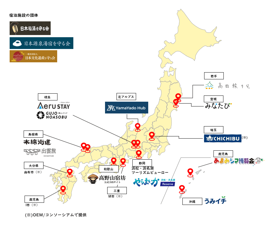 ちいプラは、以下の地域・団体様でご活用いただいています。流通額14億円、予約件数4万件、会員数26万人、参画事業者数300が利用するシステム基盤として安定稼働しています。日本秘湯を守る会様、やらまいか浜松・浜名湖様、郡上ノアソブ様、あまみシマ博覧会さまは他社システムからの乗り換え(理由は圧倒的な機能とコストパフォーマンスの違い)です。うみイチ様(沖縄県)は法人を新規設立するほど高い熱量で地域OTAに取り組まれています。